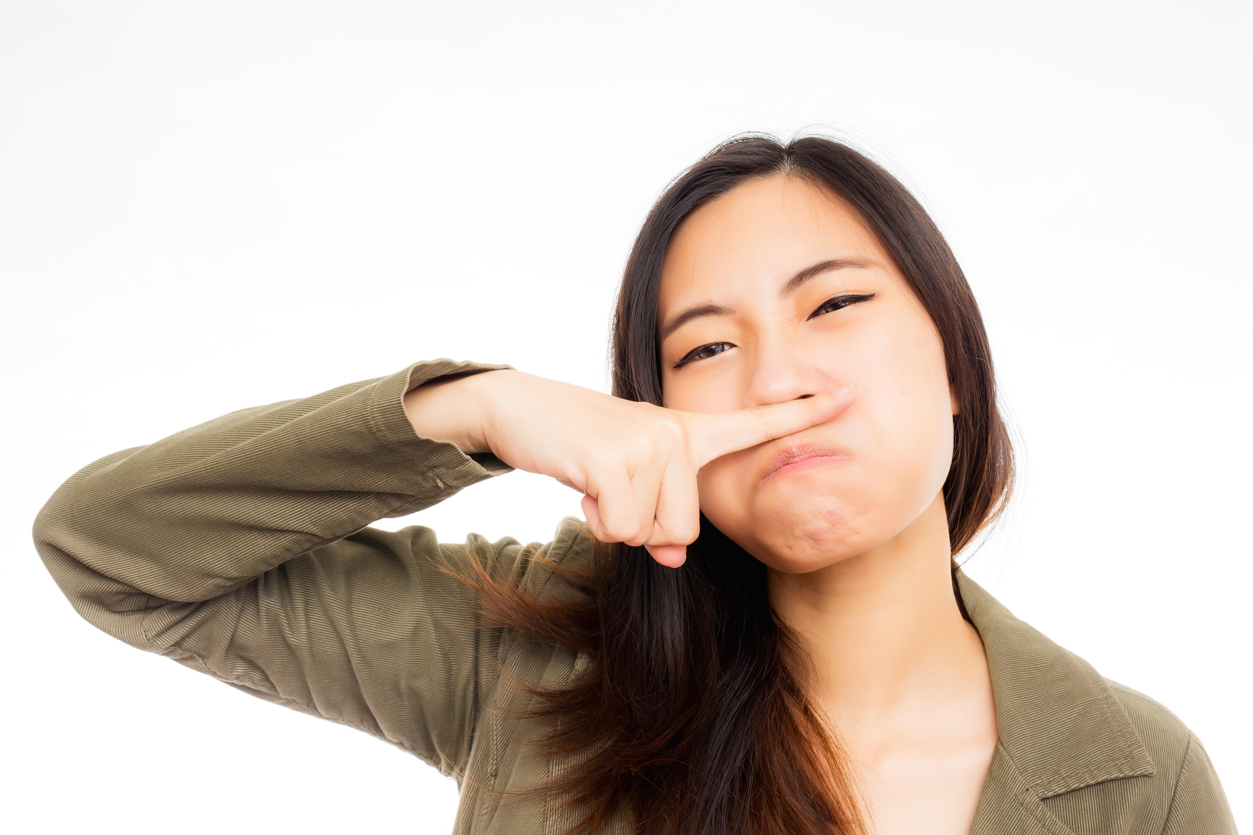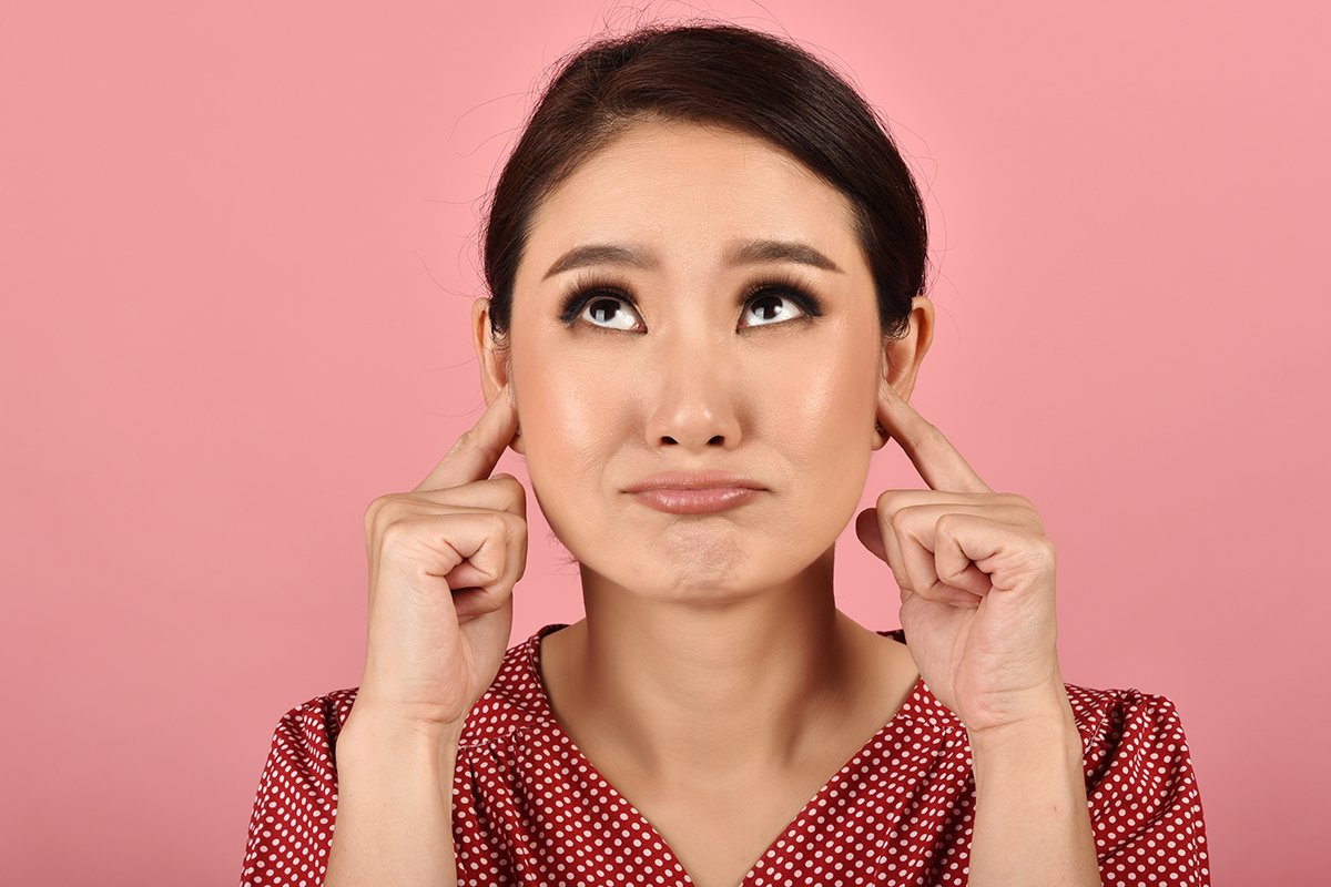Portrait of Asian Woman Shut Ears and Feeling Discomfort from Loud Noise, Annoyi