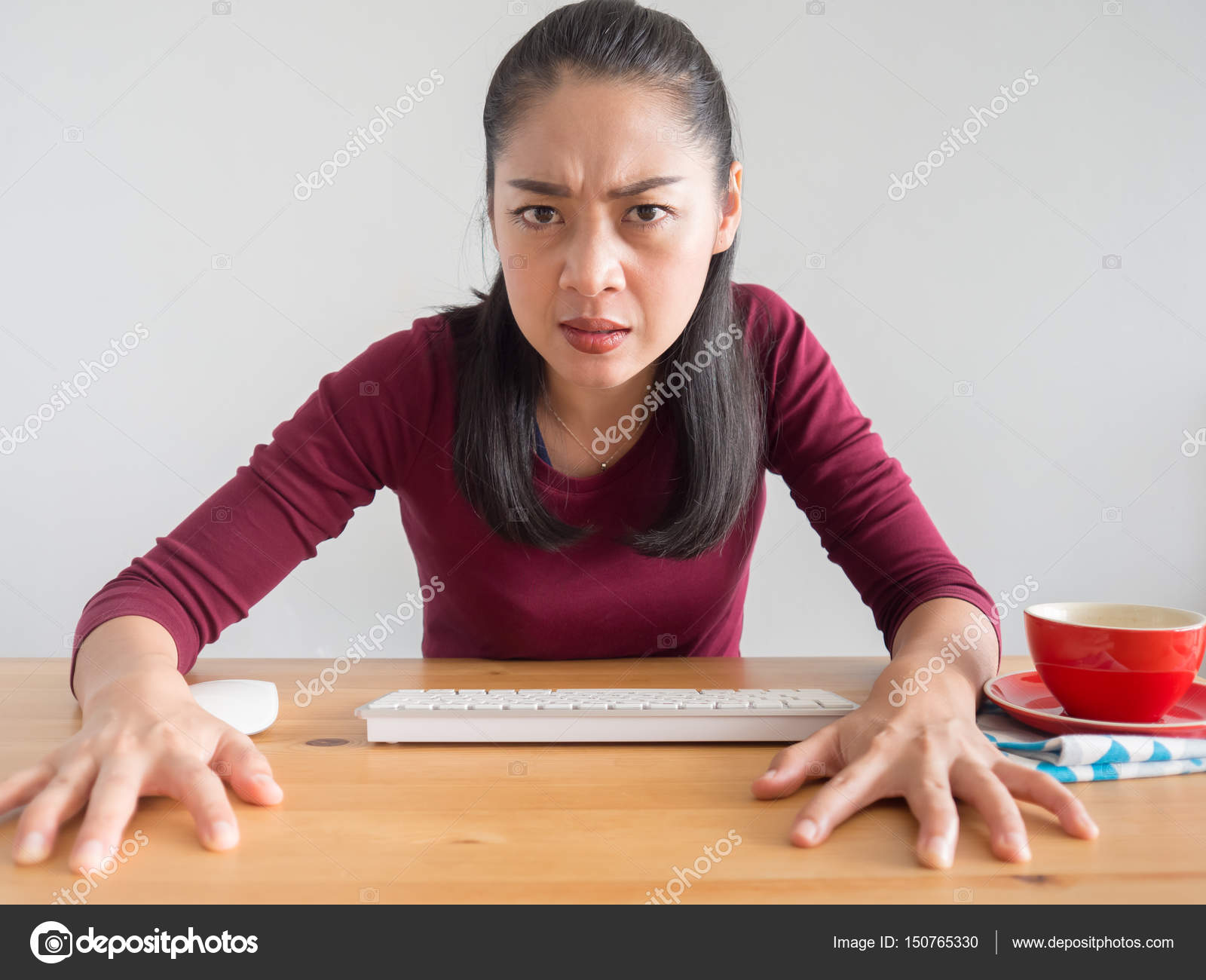 Annoyed Angry Asian Woman Working Her Office Desk Coffee Mouse - Stock Photo © s